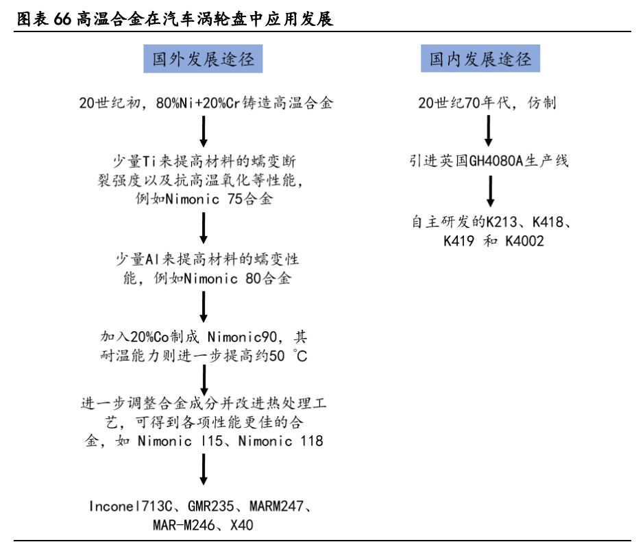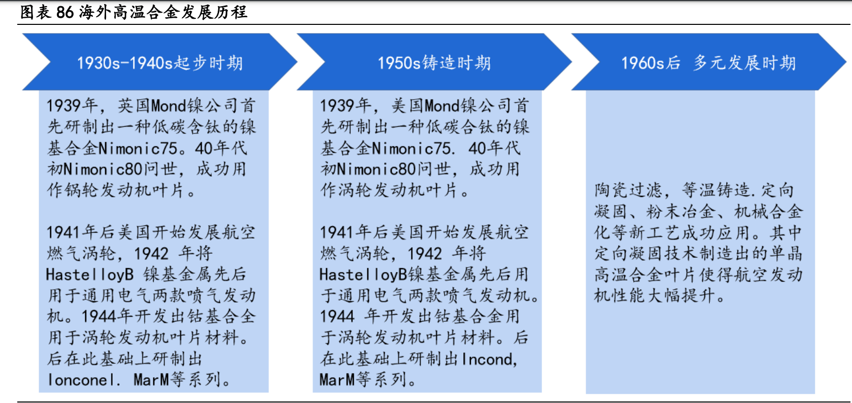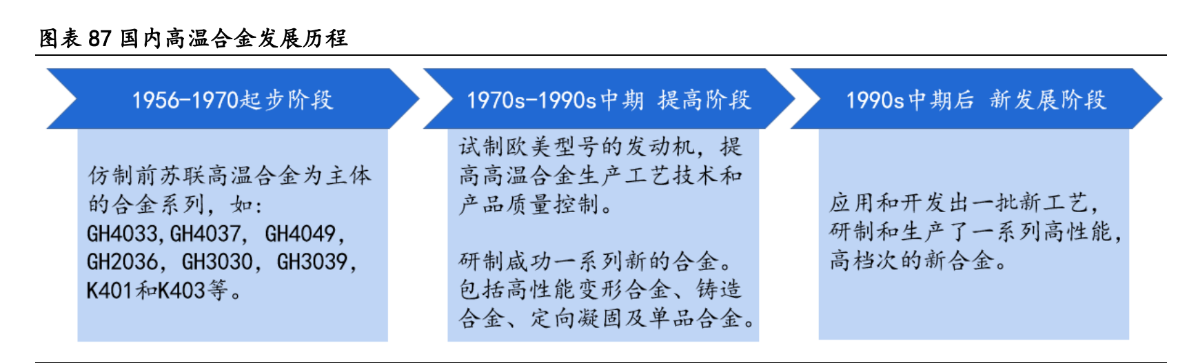 我国的高温合金的研发生产起步较晚,从 1956 年开始仿制到目前的独创研发已经历经了六十多年。从 1956 年至 20 世纪 70 年代初,我国高温合金发展处于创业和 起始阶段,在本时期我国主要仿制前苏联高温合金为主体的合金系列,包括 GH4033、 GH4037、GH4049、K401 和 K403 等。此外,我国还针对缺少镍铬资源的情况研制出铁 镍基高温合金来进行替代。从 20 世纪 70 年代中至 90 年代中期,我国高温合金行业 进入提高阶段。本阶段,我国在仿制欧美发动机的过程中引进一系列欧美体系的合 金和技术,按照国外的技术标准进行研发和生产,并且参照国外的技术规范加强质 量控制和检测流程。研发成果方面,我国研制出包括高性能变形高温合金、定向凝 固合金和单晶合金在内的新合金类型。从 20 世纪 90 年代中至今是我国高温合金的 新发展阶段。这段时期,我国独立开发并应用新的生产工艺,并且研制和生产具备 高新能的高温合金,包括氧化物弥散强化高温合金、粉末高温合金、单晶高温合金 等。