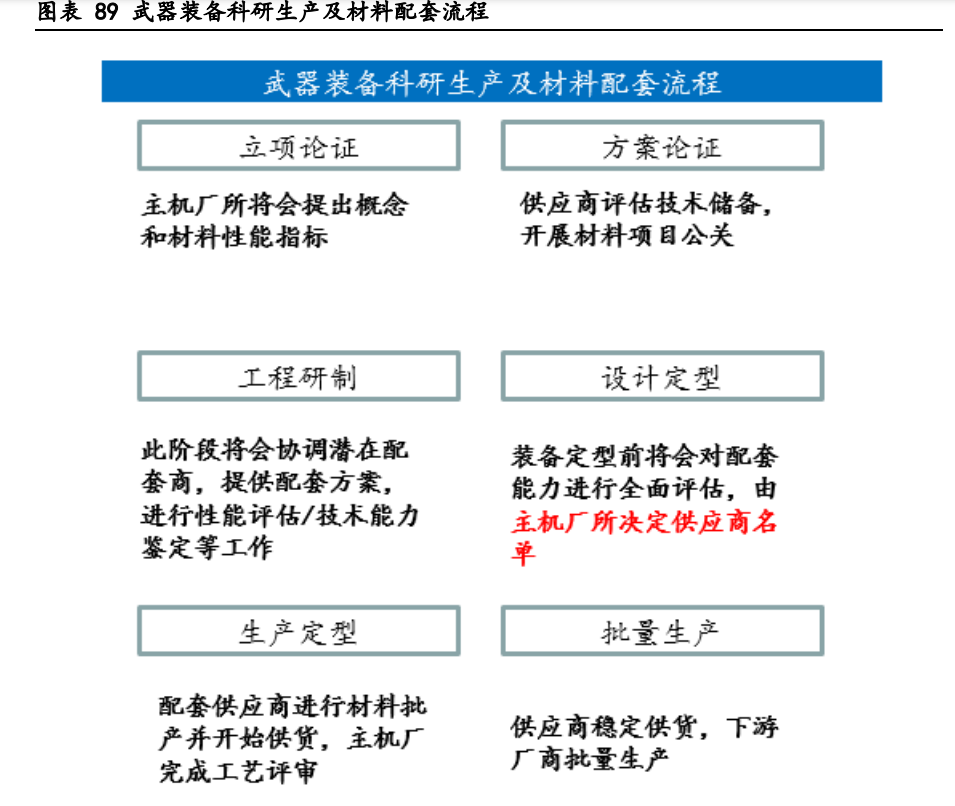 供应稳定性,军品研制过程的关键是技术状态控制,装备结束研制阶段后 会进行设计定型,定型方案中会细化到具体原材料的型号和供应商。因此, 已经设计定型的武器装备大多会一直使用选定的原材料和对应的供应商, 直至新项目立项或该型号停产。