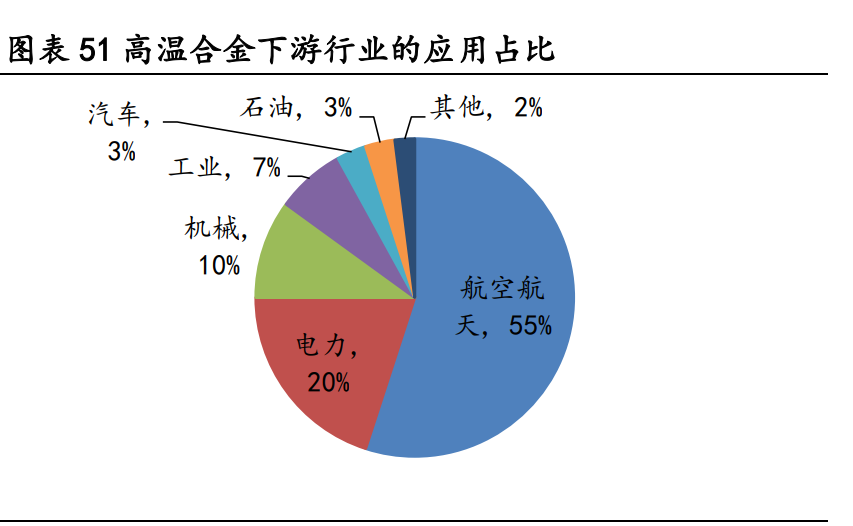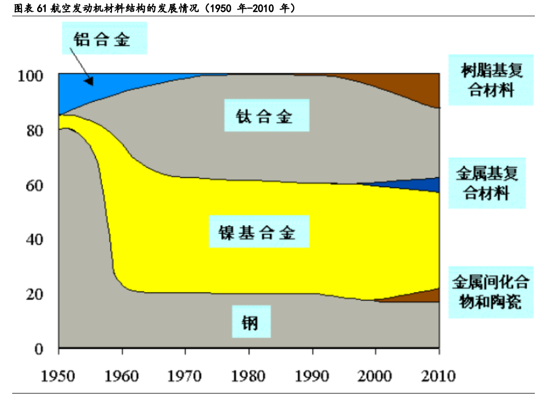 对于飞机发动机而言,耐高温的材料需求是刚需,高温合金无疑是最佳材料, 可以说,航空发动机的发展史就是高温合金的发展史,两者互相成就。当前最先进 的战机中高温合金的用量已经超过 50%,主要用于燃烧室、导向器、涡轮叶片和涡轮 盘四大热端部件,此外还用于机匣、环件、加力燃烧室和尾喷口等部件,其未来用量 占比依然呈现不断增长的趋势,价值占比有望进一步提升。