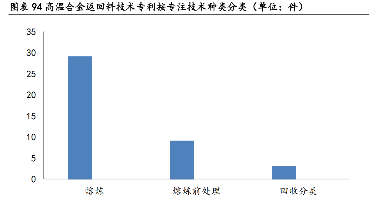 以“返回料”为搜索关键词,知网显示一共 41 件涉及高温合金返回料专利。目前高温合金返回料技术正处于各大企业专利布局的起步阶段,各企业专注领域依然 有较大差异,各领域尚未出现绝对的龙头企业,因而各企业均有可能在各细分领域 中逐步布局并成长为龙头企业。