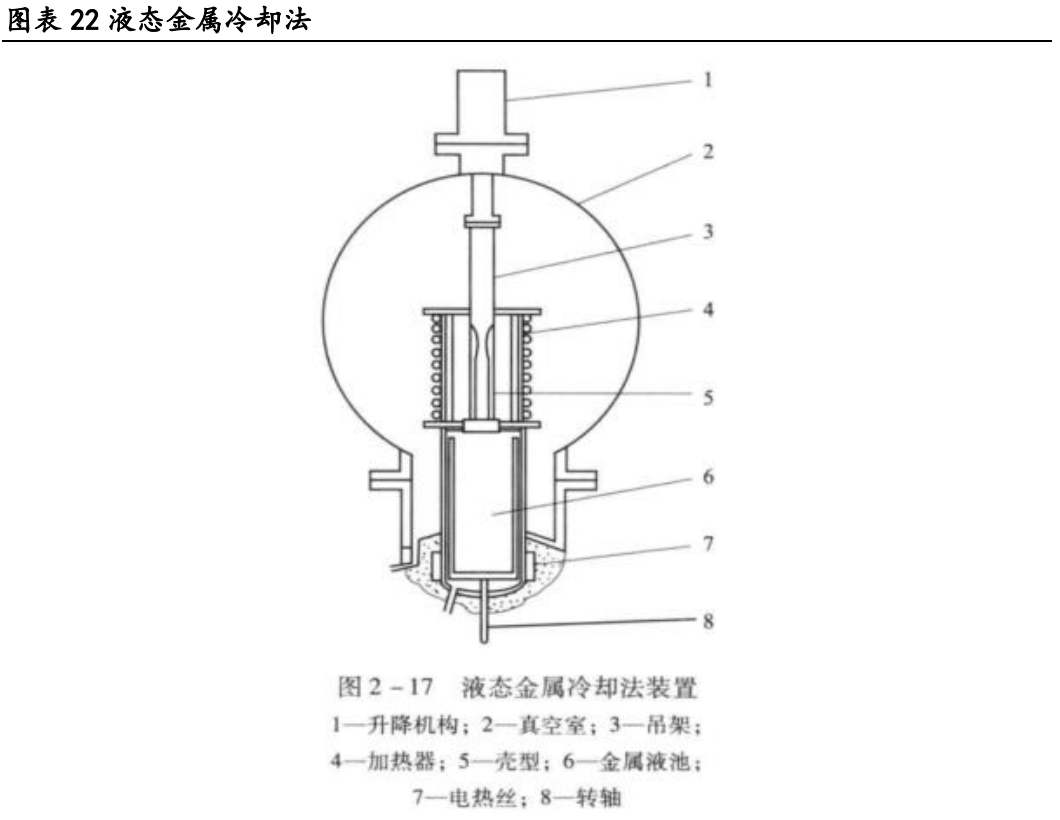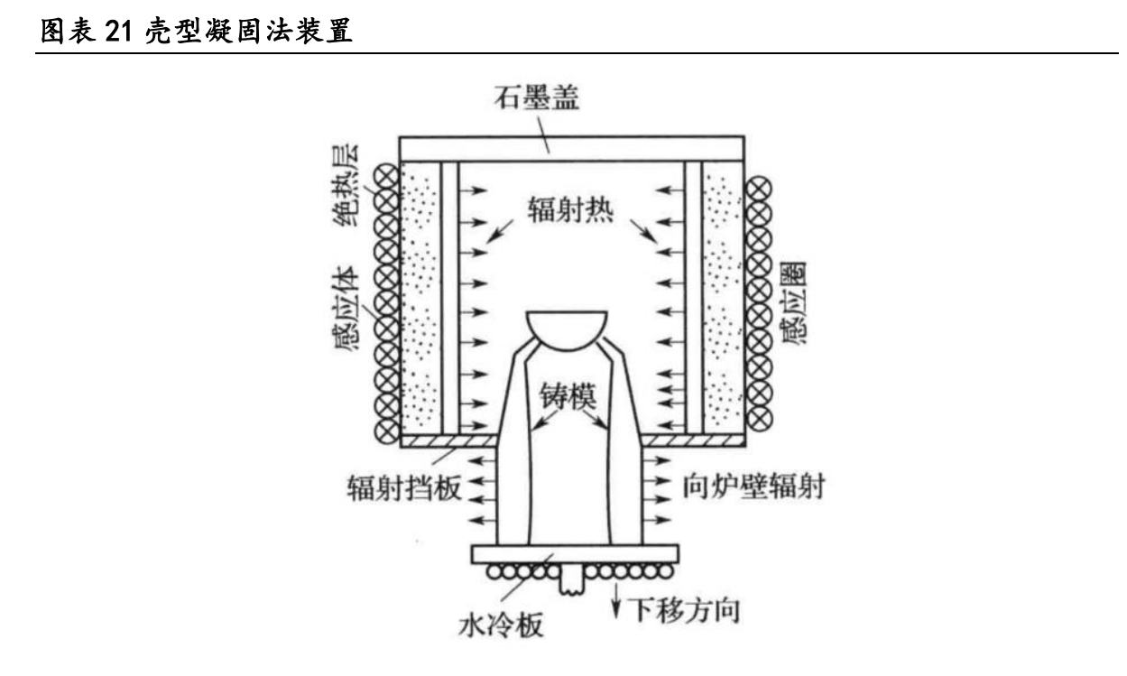 凝固设备方面,相较于定向凝固工艺,单晶凝固要求更加严格,因而如何 对壳型法设备进行改造,以提升温度梯度和控制热流成为难点。