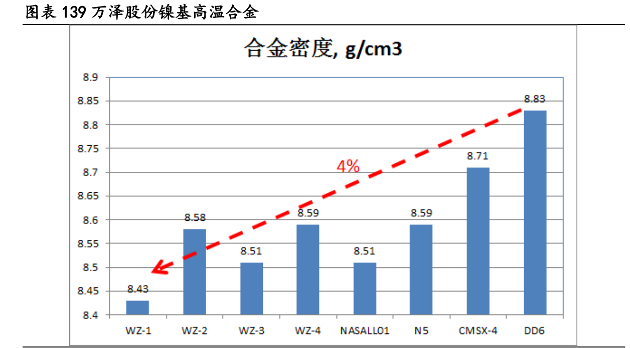 根据深圳万泽中南研究院官网,万泽万泽以 CMSX-4、RenéN5、DD6 等三个合金 为参比合金,比较其密度、热处理窗口的大小、强化相γ’的含量、强化相γ’的热 稳定性、TCP 有害相的含量及稳定性等因素,成功设计出具有自主知识产权的低密度 高性能镍基高温合金。目前万泽已经能够生产包括等轴晶、定向凝固、单晶合金在 内的几十种牌号的母合金,适用于 650-1100℃范围内的不同温度环境。高温合金母 合金主要供应发动机厂、其它精密铸造厂生产民用航空发动机、燃气轮机。