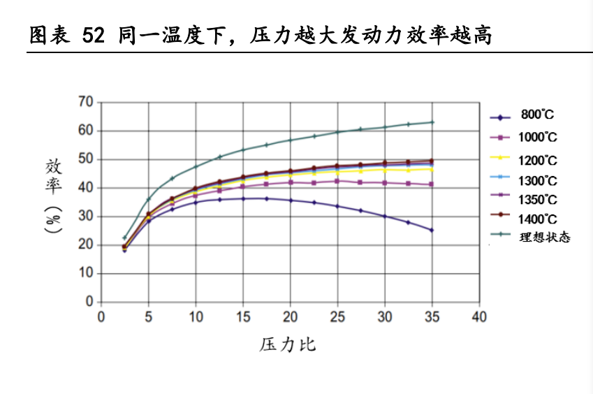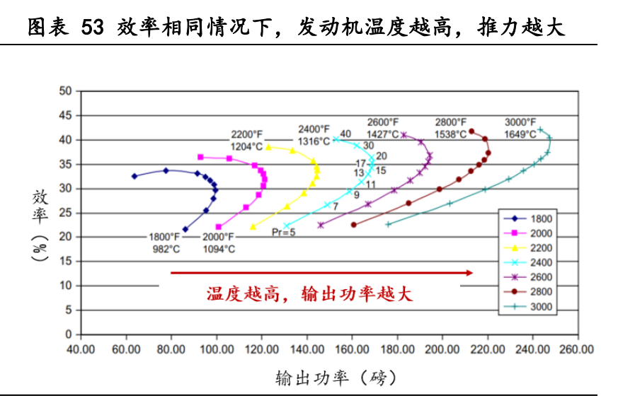 温度和压力对内燃机效率至关重要。从热力学第二定律出发可知,相同的压比 情况下,透平入口温度越高,内燃机效率越高;相同的透平入口温度,压比在一定范 围内与效率成正比。其中温度的影响最为显著,根据《Boyce》显示,温度每升高 100 ℉(55.5℃),功输出增加约 10%,效率提高约 0.5-1%。为了提高燃机输出效率,航 空航天发动机、燃气轮机的热端部件需承受 600℃~1200℃的高温以及复杂应力的 交互作用,材料要求非常苛刻,高温合金是这些装备的关键材料。镍基高温合金有 高的耐热强度、良好的塑性、优秀的抗高温氧化和燃气腐蚀能力,以及长期组织稳 定性等特性,被广泛用于制造各种高温部件。