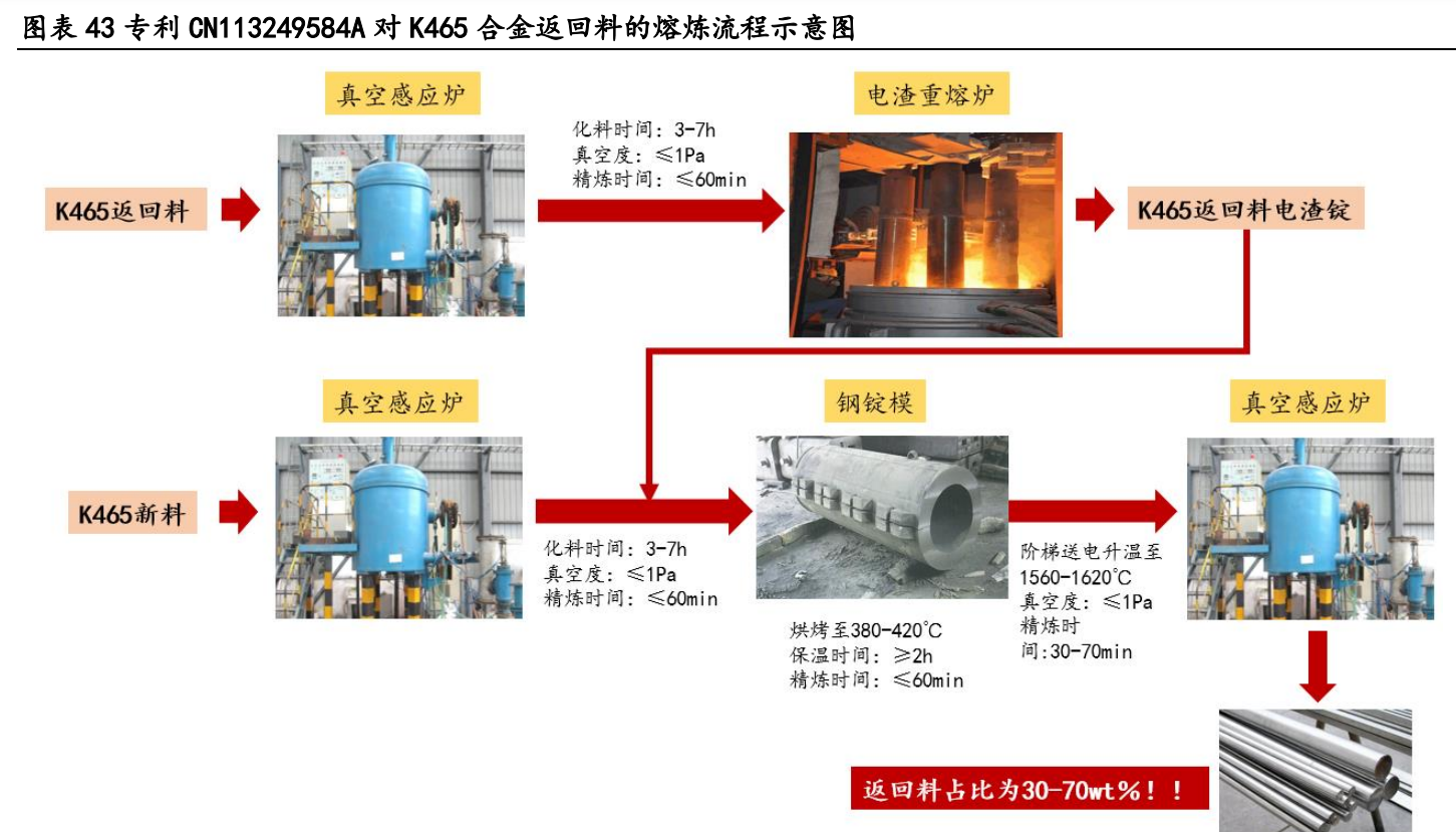 钢研高纳在专利号 111534713 B 指出,定向高温合金 DZ4125,由于含有高含量的钴、 钨、钽、铪等贵金属元素,新料母合金价格昂贵,达到 75 万元/吨,如果以含镍量 60%回收,返回料的价格仅为 5 万元/吨左右。目前返回料一般作为废品处理,一般 仅能回收其中的镍元素,其它贵金属元素都浪费了,而且还会给下游产品(如不锈 钢)的质量带来很大的不利影响。因此高温合金返回料的回收重新利用,大大提高 了材料利用率,降低了资源浪费,具有非常重要的意义。