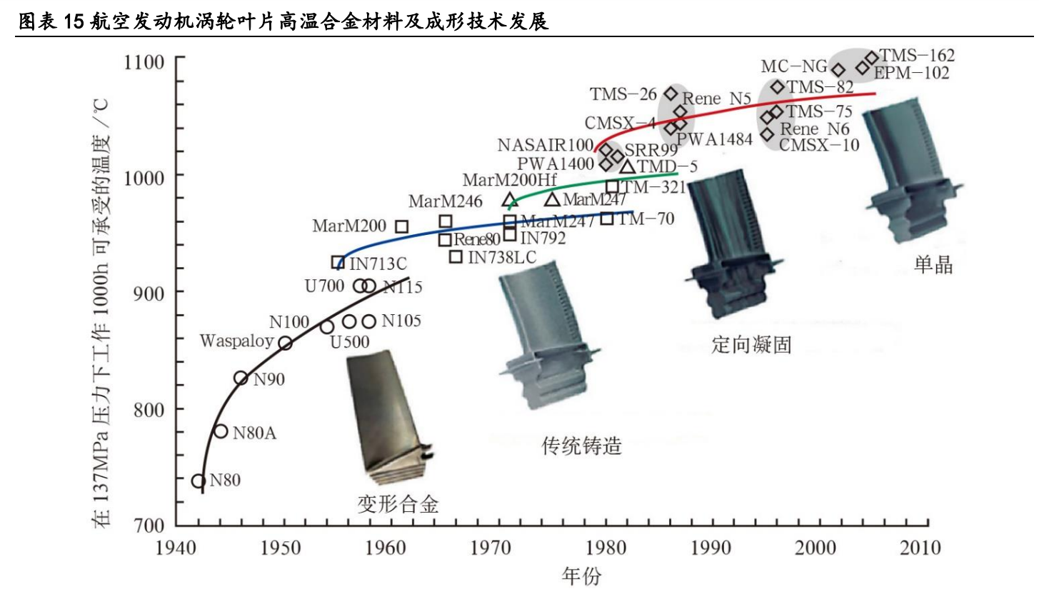 20 世纪 60 年代,定向凝固技术的发展,促进了定向柱状晶和单晶高温合金 的蓬勃发展,航空发动机的使用温度达到 1700℃以上。