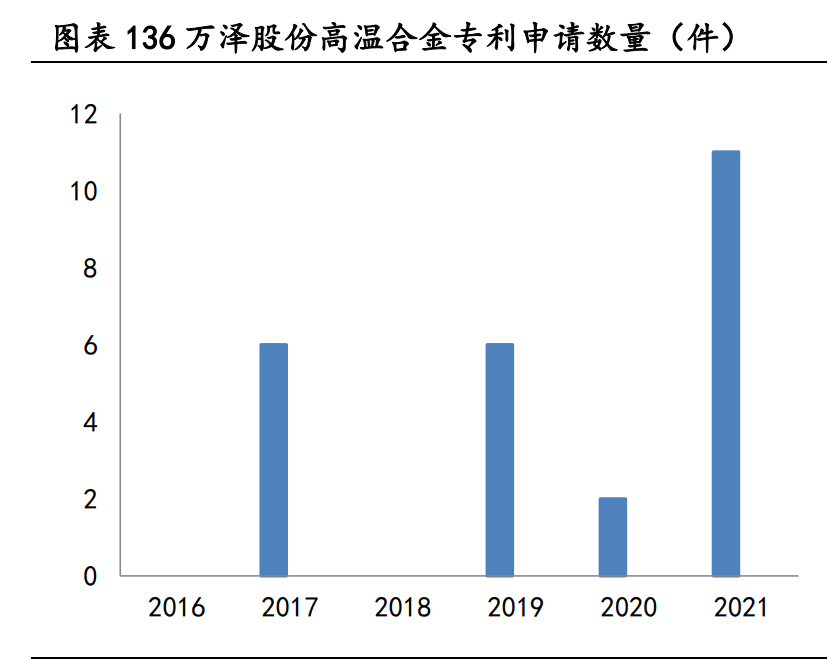 公司以万泽中南研究院作为高温合金的技术研发平台,持续推进高温合金产业 化所必需的基础技术研发。双性能第三代粉末盘项目、两盘国产化项目、“创新链+ 产业链” 融合专项等承接的国家、省、市级科研项目均按计划稳步推进中,并拟承 接高温合金先进定向凝固技术、发动机叶片修复用合金材料研究、新一代单晶高温 合金叶片研发及产业化等各级科研项目,同时与中南大学、西安交大、上海大学等 高校及有关科研院所开展技术合作和项目研究,顺利入驻涡轮院科创中心、共建联 合创新团队。2021 年是公司高温合金叶片项目高速发展的一年,全年共立项 53 项, 按计划节点完成 49 项,全年研发生产涡轮叶片并实现成品交付 7474 件。报告期内, 通过厂房改造优化布局及工艺升级,长沙精铸中心已具备单晶/定向涡轮叶片铸件 7000 件/年的产能,小批量试制能力进一步提升。截至 2021 年 12 月 31 日,万泽中 南研究院累计申请发明专利 36 项、实用新型专利 35 项、软件著作权 4 项,已获得 授权 47 项。