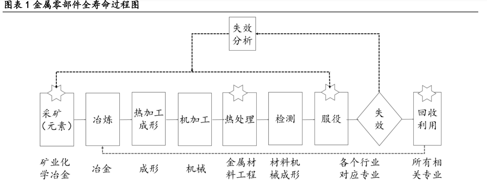 从金属材料被制成零部件服役的流程来看,主要分为采矿、冶炼、加工等环节。 零部件的全寿命过程较长,任何一个流程都不能作为金属零部件的绝对主导因素, 上游的流程势必会对下游流程产生一定的影响,因而对于金属材料而言,产业链联 动效果较强,每一环节都可能诞生一批极具实力的优质公司。