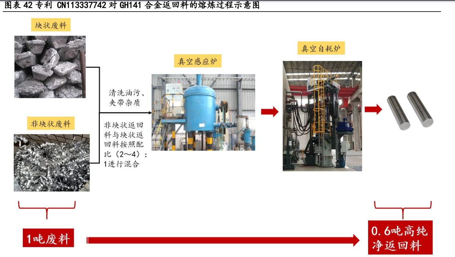 高返回料添加比的高温合金加工方式与通常高温合金加工方式几无差异,故亦 可以通过工艺改进进一步降低其成本。中国航发北京航空材料研究院专利号 CN111761007A《一种添加返回料的 GH4169 合金盘锻件制备方法》一文中指出,当前 国内 GH4169 盘锻件所用棒材均为矿冶新料经熔炼和锻造所制造,返回料的使用仅局 限于各冶金厂自身熔炼和锻造过程所产生的“废料”,使用比例非常低。高温合金返 回料中的碎屑料和块状料均是合格高温合金材料加工的边角余料,经过了多次的真 空提纯和精炼,纯净度水平要高于矿冶新料,如果能够实现同等级别相同材料的循 环利用,将有效提升高温合金材料的纯净度,且能显著降低原材料成本。这也是国 外相同合金 IN718 质量优、价格低的主要原因之一。为了提高返回料再生利用技术 成熟度,促进 GH4169 合金制造成熟度的提高,提升 GH4169 盘锻件整体质量,同时降低盘锻件的制造成本,航材院提出一种添加返回料的GH4169合金盘锻件制备方法, 该方法可以细化盘锻件的晶粒组织,提升锻件组织均匀性,同时缩短锻件制造周期, 降低锻件成本。(报告来源:未来智库)