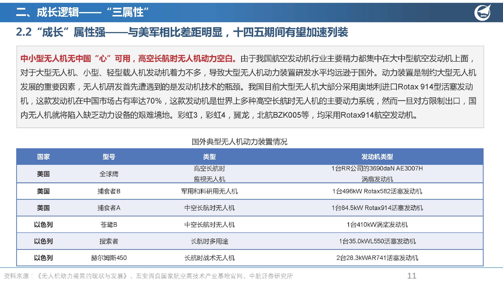 中小型无人机无中国“心”可用,高空长航时无人机动力空白。由于我国航空发动机行业主要精力都集中在大中型航空发动机上面, 对于大型无人机、小型、轻型载人机发动机着力不多,导致大型无人机动力装置研发水平均远逊于国外。动力装置是制约大型无人机 发展的重要因素,无人机研发首先遭遇到的是发动机技术的瓶颈。我国目前大型无人机大部分采用奥地利进口Rotax 914型活塞发动 机,这款发动机在中国市场占有率达70%,这款发动机是世界上多种高空长航时无人机的主要动力系统,然而一旦对方限制出口,国 内无人机就将陷入缺乏动力设备的艰难境地。彩虹3,彩虹4,翼龙,北航BZK005等,均采用Rotax914航空发动机。
