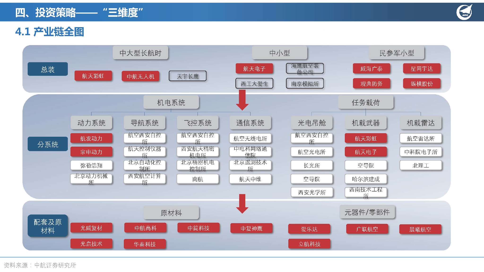 具体来看,军用无人机产业链上的企业可以分为三个 层级:上游的航空材料及元器件供应商,中游的机电、 载荷等分系统制造企业,以及位于下游的整机制造企 业。