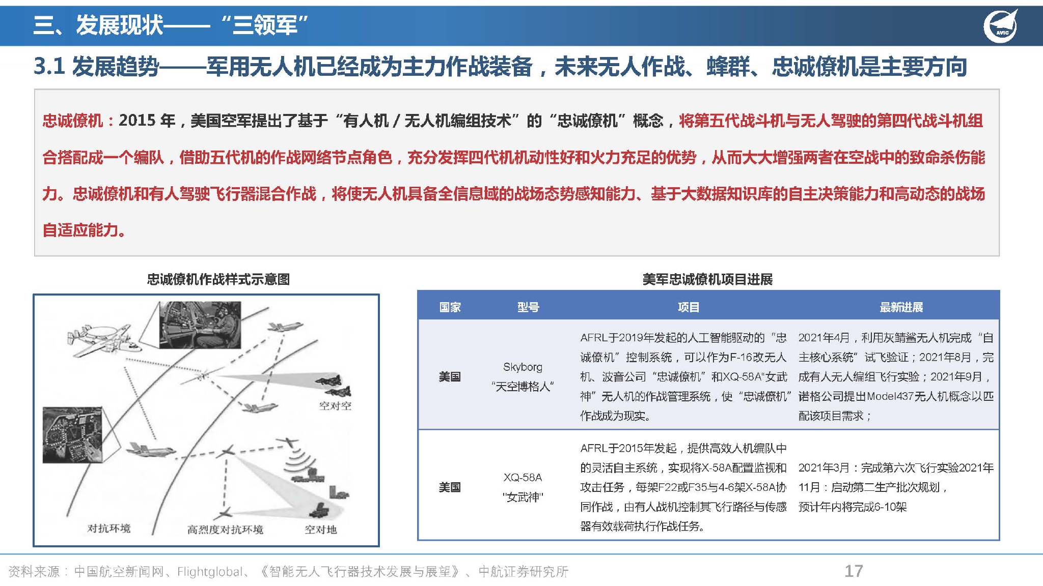 忠诚僚机:2015 年,美国空军提出了基于“有人机 / 无人机编组技术”的“忠诚僚机”概念,将第五代战斗机与无人驾驶的第四代战斗机组 合搭配成一个编队,借助五代机的作战网络节点角色,充分发挥四代机机动性好和火力充足的优势,从而大大增强两者在空战中的致命杀伤能 力。忠诚僚机和有人驾驶飞行器混合作战,将使无人机具备全信息域的战场态势感知能力、基于大数据知识库的自主决策能力和高动态的战场 自适应能力。