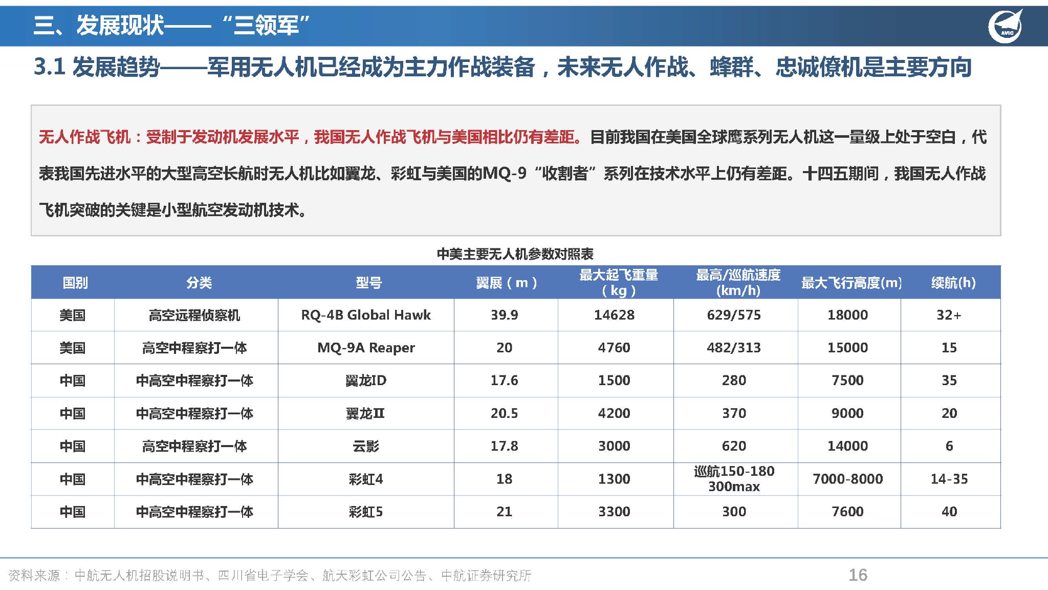 无人作战飞机:受制于发动机发展水平,我国无人作战飞机与美国相比仍有差距。目前我国在美国全球鹰系列无人机这一量级上处于空白,代 表我国先进水平的大型高空长航时无人机比如翼龙、彩虹与美国的MQ-9“收割者”系列在技术水平上仍有差距。十四五期间,我国无人作战 飞机突破的关键是小型航空发动机技术。