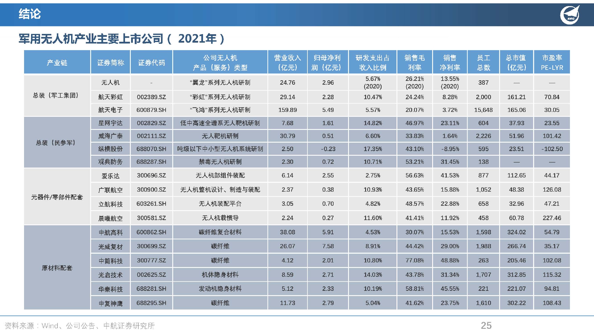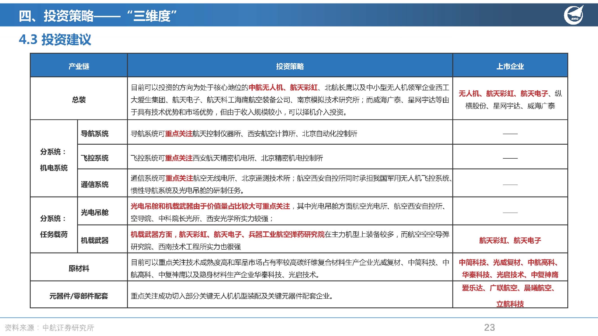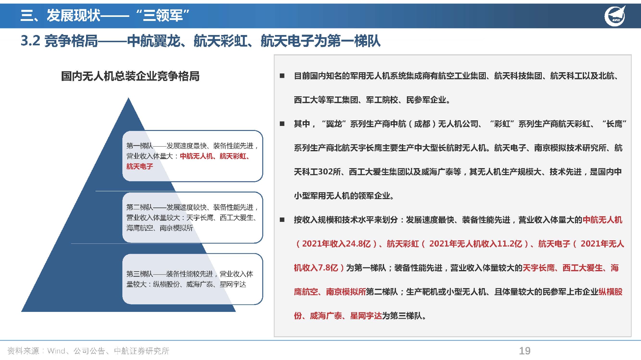 其中,“翼龙”系列生产商中航(成都)无人机公司、“彩虹”系列生产商航天彩虹、“长鹰” 系列生产商北航天宇长鹰主要生产中大型长航时无人机。航天电子、南京模拟技术研究所、航 天科工302所、西工大爱生集团以及威海广泰等,其无人机生产规模大、技术先进,是国内中 小型军用无人机的领军企业。