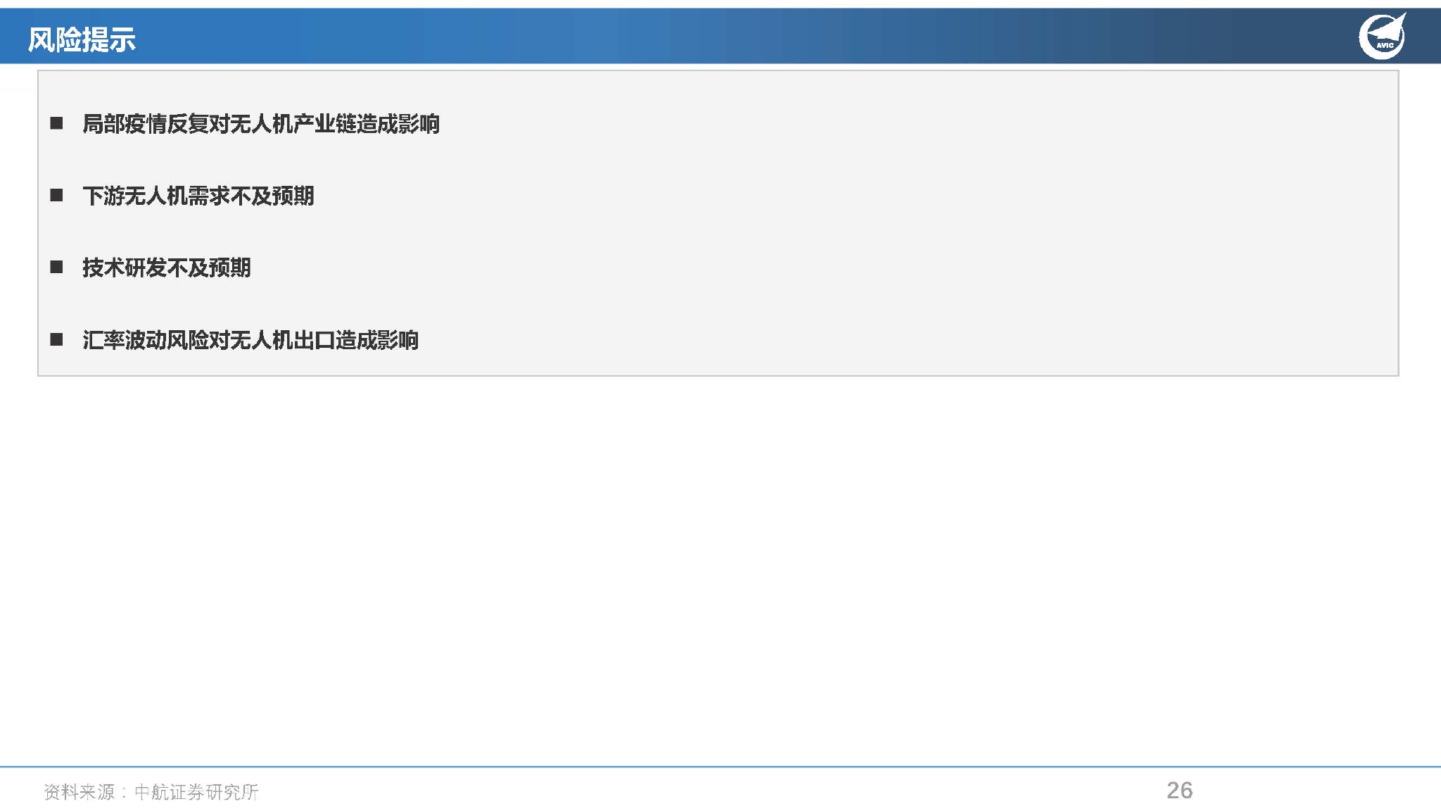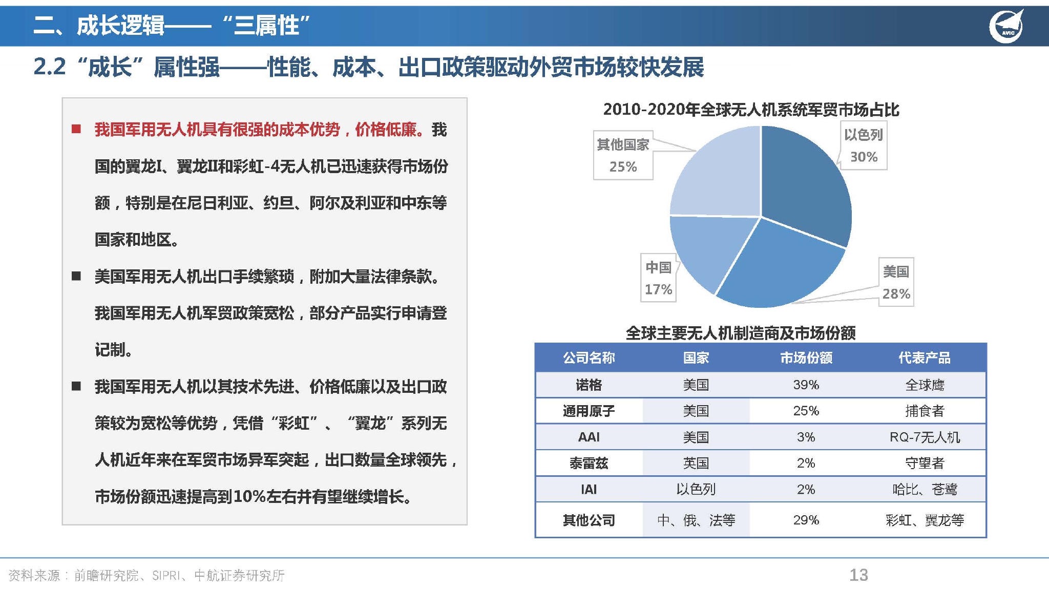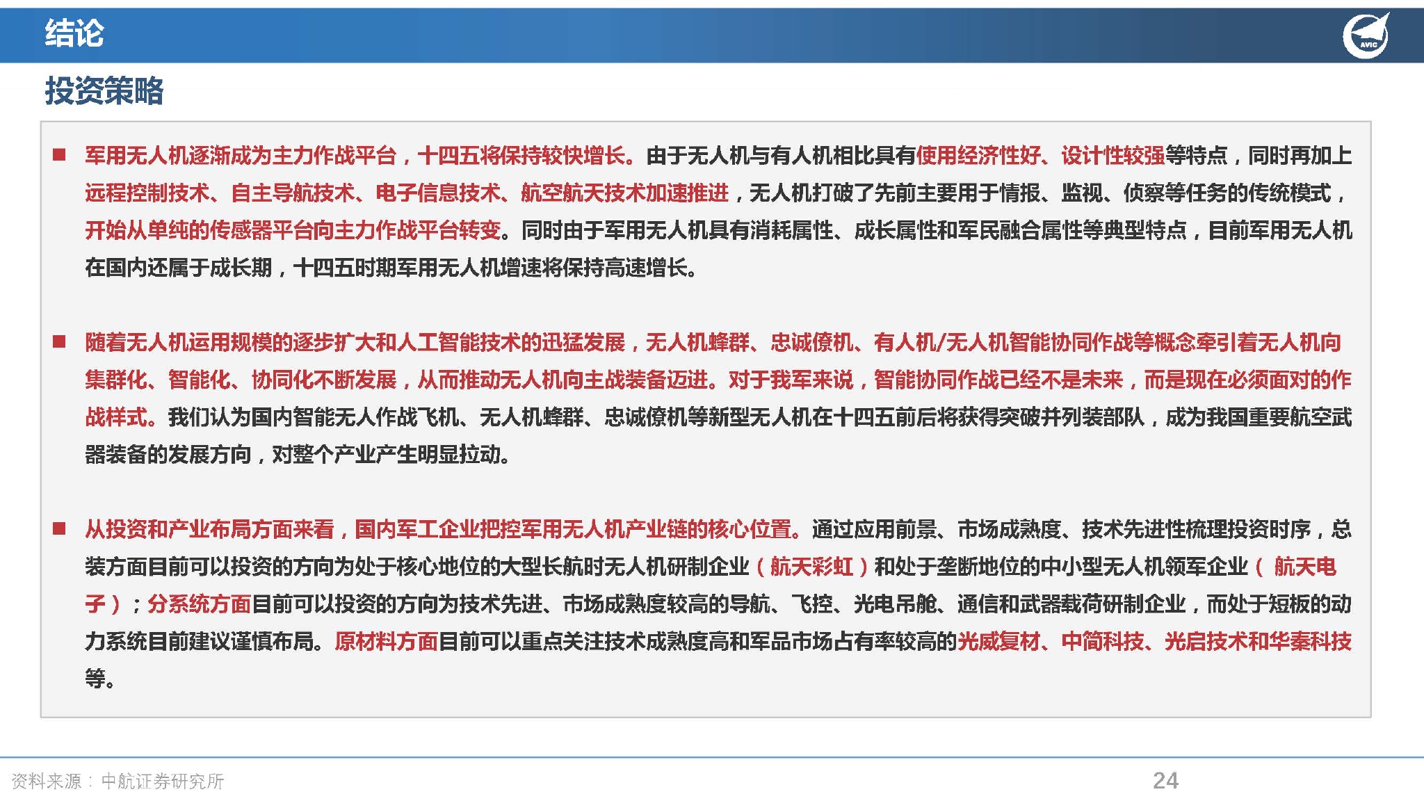 其中,“翼龙”系列生产商中航(成都)无人机公司、“彩虹”系列生产商航天彩虹、“长鹰” 系列生产商北航天宇长鹰主要生产中大型长航时无人机。航天电子、南京模拟技术研究所、航 天科工302所、西工大爱生集团以及威海广泰等,其无人机生产规模大、技术先进,是国内中 小型军用无人机的领军企业。