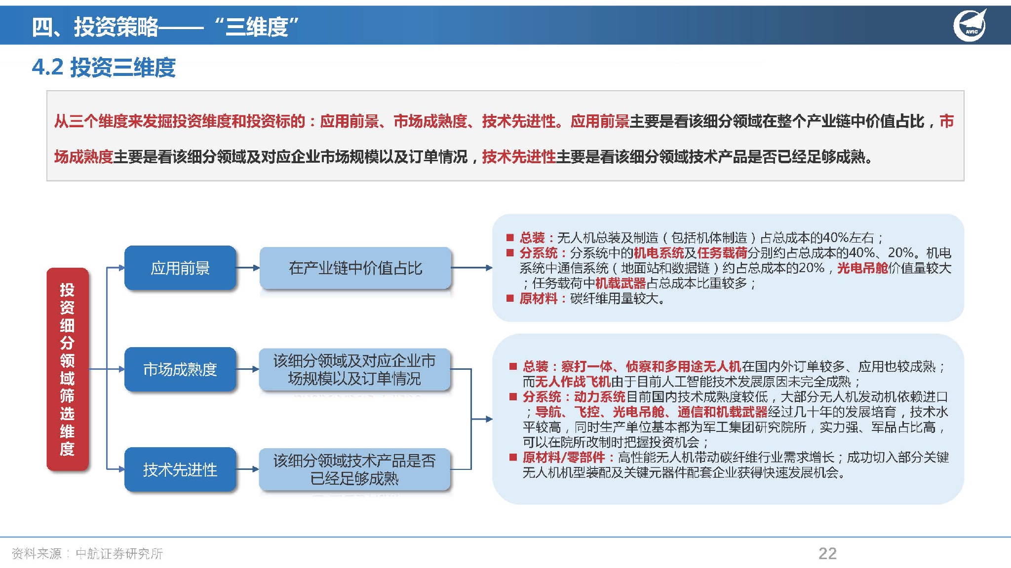 从三个维度来发掘投资维度和投资标的:应用前景、市场成熟度、技术先进性。应用前景主要是看该细分领域在整个产业链中价值占比,市 场成熟度主要是看该细分领域及对应企业市场规模以及订单情况,技术先进性主要是看该细分领域技术产品是否已经足够成熟。