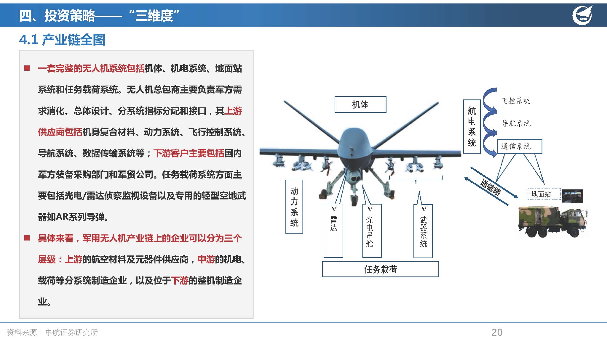 一套完整的无人机系统包括机体、机电系统、地面站 系统和任务载荷系统。无人机总包商主要负责军方需 求消化、总体设计、分系统指标分配和接口,其上游 供应商包括机身复合材料、动力系统、飞行控制系统、 导航系统、数据传输系统等;下游客户主要包括国内 军方装备采购部门和军贸公司。任务载荷系统方面主 要包括光电/雷达侦察监视设备以及专用的轻型空地武 器如AR系列导弹。