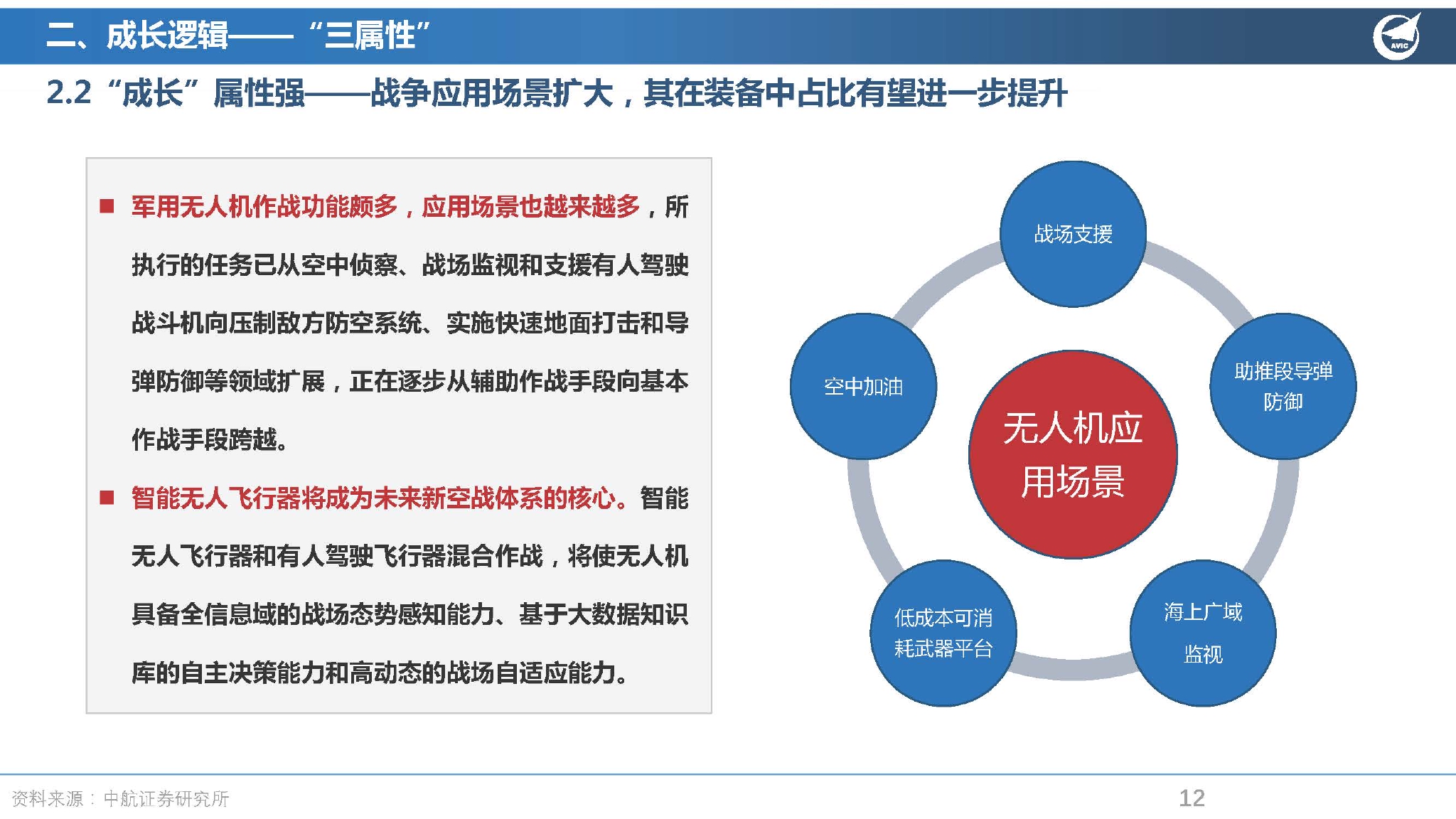 军用无人机作战功能颇多,应用场景也越来越多,所 执行的任务已从空中侦察、战场监视和支援有人驾驶 战斗机向压制敌方防空系统、实施快速地面打击和导 弹防御等领域扩展,正在逐步从辅助作战手段向基本 作战手段跨越。