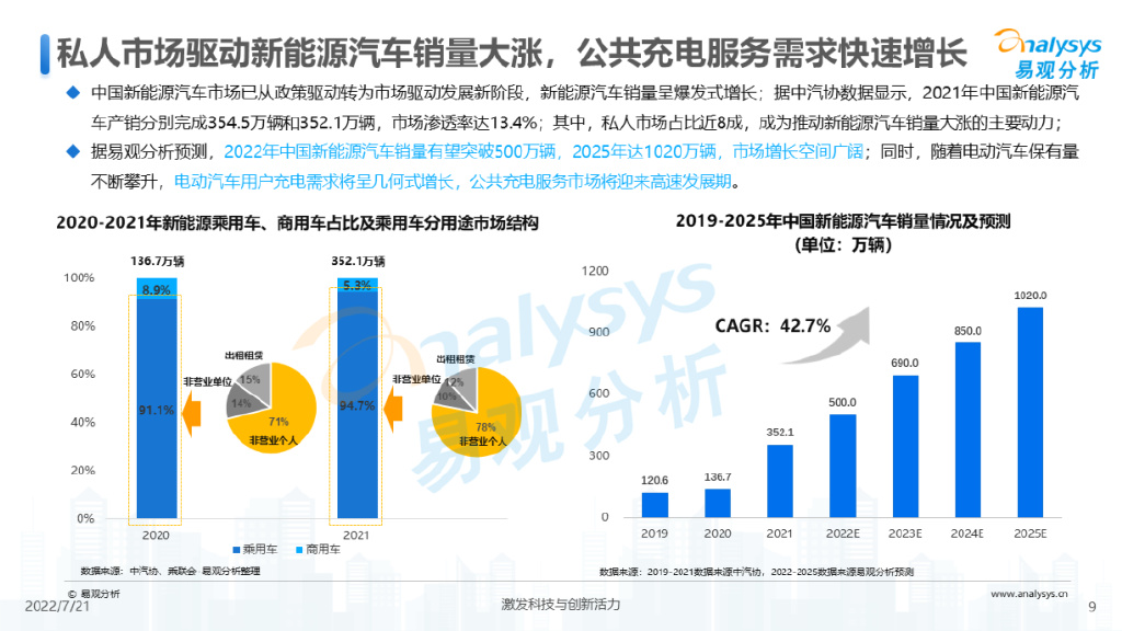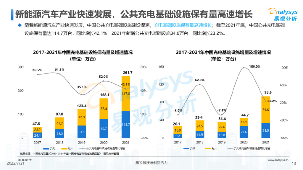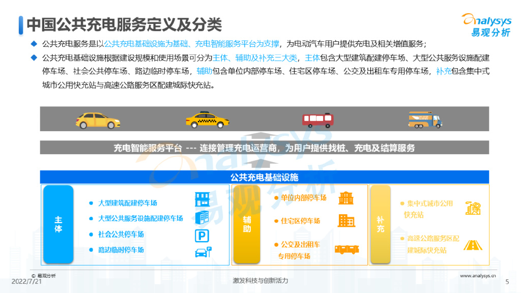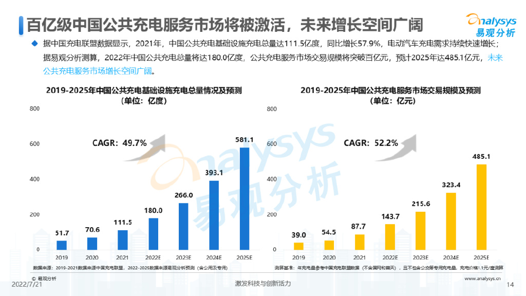 易观分析:公共充电服务是以公共充电基础设施为基础、充电智能服务平台为支撑,为电动汽车用户提供充电及相关增值服务。2026年后,在国家政策积极引导、社会资本持续投入、电动汽车用户需求日益增长的共同作用下,充电基础设施体系和生态建设快速发展,中国公共充电服务市场将进入成熟期。据中国充电联盟数据显示,2021年,中国公共充电基础设施充电总量达111.5亿度,同比增长57.9%;据易观分析测算,2022年中国公共充电总量将达180.0亿度,公共充电服务市场交易规模将突破百亿元,预计2025年达485.1亿元,未来公共充电服务市场增长空间广阔。1ZK客商网-商会、协会、校友会、俱乐部资源整合社交平台