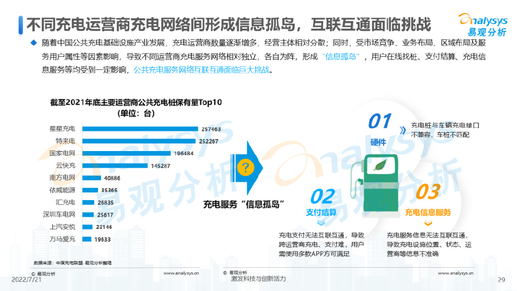- 不同充电运营商充电网络间形成信息孤岛,互联互通面临挑战;
