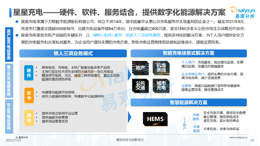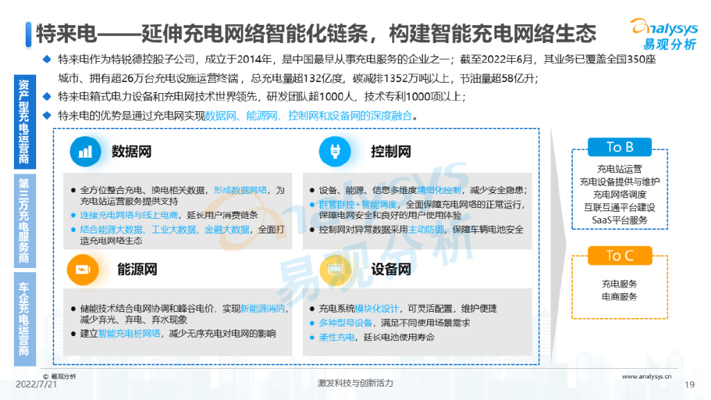 - 以特来电、星星充电等为代表的资产型充电运营商,专注于自有充电相关资产运营。其中,特来电作为特锐德控股子公司,成立于2014年,是中国最早从事充电服务的企业之一。截至2022年6月,其业务已覆盖全国350座城市、拥有超26万台充电设施运营终端,自成立以来累计充电量超132亿度,碳减排1352万吨以上;
