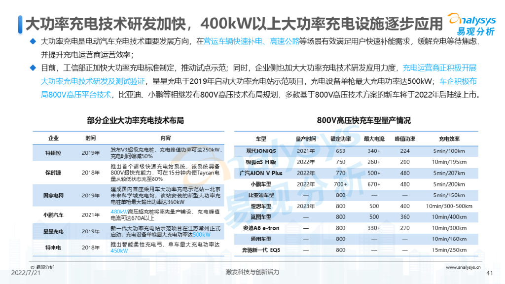 - 大功率充电技术研发加快,400kW以上大功率充电设施逐步应用;