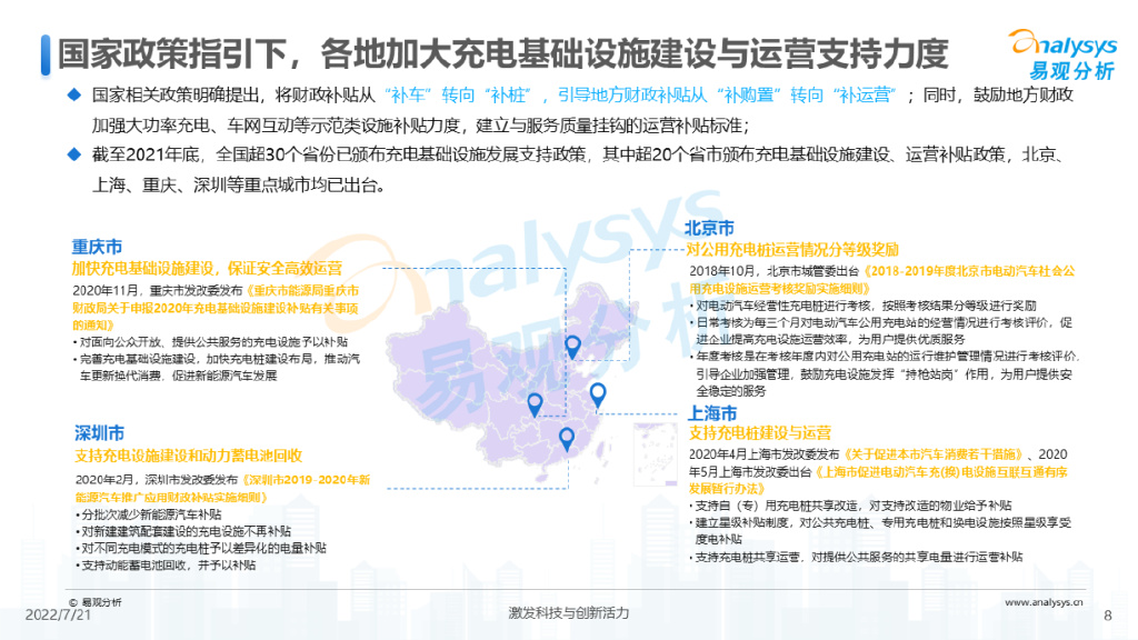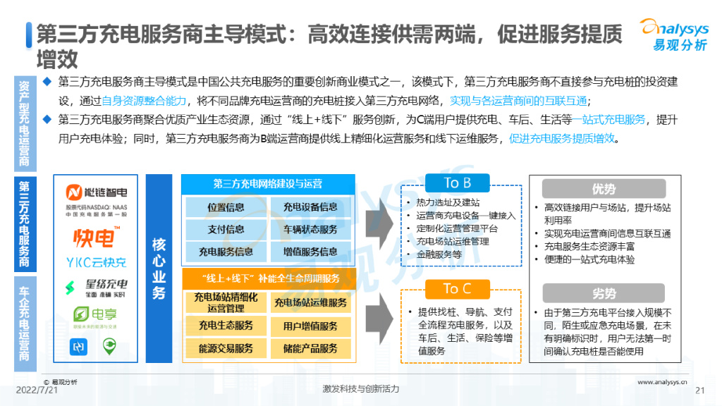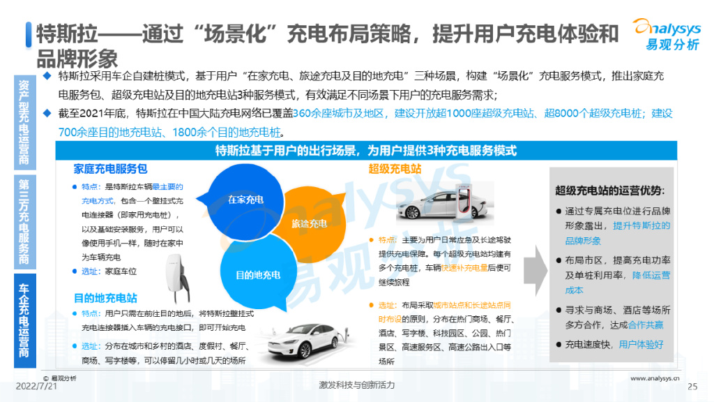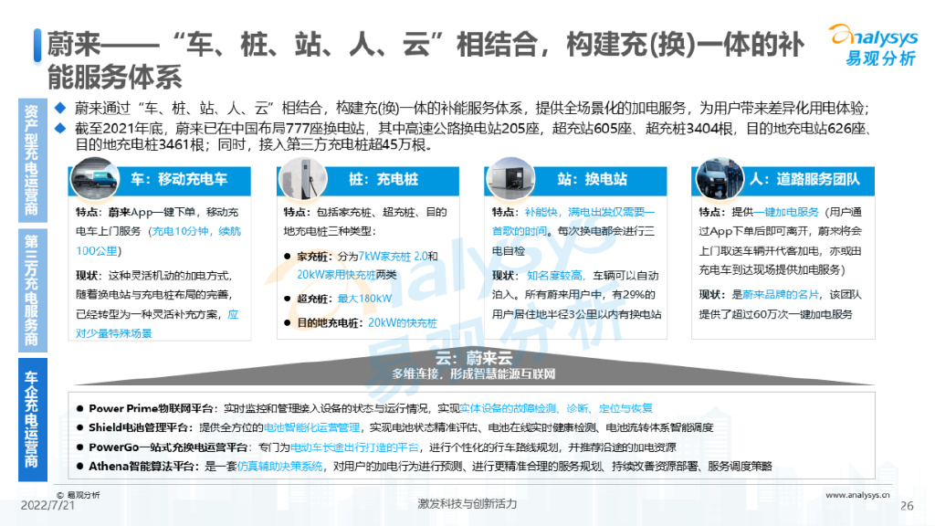 - 以蔚来、特斯拉等为代表的车企充电运营商,为自有车主提供公共充电等服务。其中,蔚来通过“车、桩、站、人、云”相结合,构建充(换)一体的补能服务体系,提供全场景化的加电服务;截至2021年底,蔚来已在中国布局777座换电站,其中高速公路换电站205座,超充站605座、超充桩3404根,目的地充电站626座、目的地充电桩3461根,接入第三方充电桩超45万根。