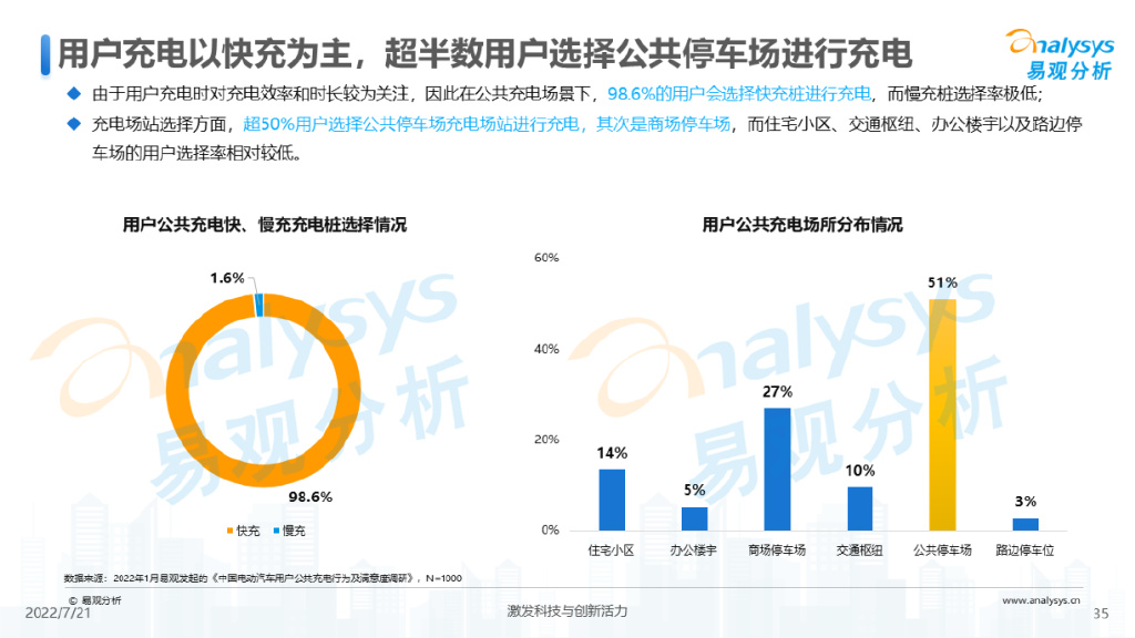 - 用户充电以快充为主,超半数用户选择公共停车场进行充电;