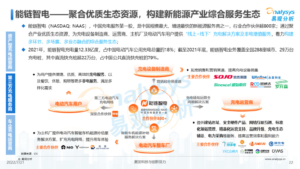 - 以能链智电、快电、云快充等为代表的第三方充电服务商,通过第三方充电网络连接用户及资产型充电运营商。其中,能链智电(NASDAQ:NAAS)是中国充电服务第一股,是中国规模最大、增速最快的新能源服务商之一,服务运营商超800家。其通过聚合产业优质生态资源,为充电设备制造商、运营商、主机厂及电动汽车用户提供“线上+线下”充电解决方案及非电增值服务,着力构建多环节、多场景、多业态融合的充电服务生态;2021年,能链智电完成充电量12.33亿度,占中国公用充电总量的18%;截至2021年底,能链智电业务覆盖全国288座城市、29万台充电桩,其中直流快充桩超22万台,占中国公共直流快充桩的79%;