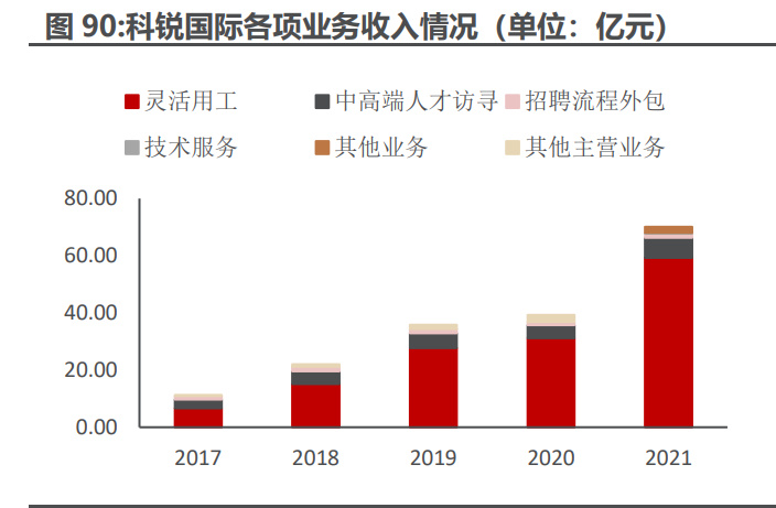 公司为灵活用工为主,兼具猎头和技术服务的国内领先灵活用工服务商。公 司成立于 1996 年,最早做猎头业务起家,后续逐步扩充招聘流程外包与灵活用工 业务;在规模上,公司采取内生与并购双轮驱动的模式,先后成立欧格林、科锐派 开展灵活用工,收购主营消费品灵活用工企业康肯、北京亦庄以及英国招聘领先招 聘服务商 Investigo。截至目前,从收入体量上来看,公司已经形成以灵活用工为 主,兼具猎头和技术服务的业务格局,业务覆盖中国、印度、新加坡、马来西亚、 美国、英国、澳大利亚、荷兰等全球市场拥有 110 余家分支机构,拥有 3300 余 名专业招聘顾问及技术人员。 2021 年公司灵活用工收入为 59.31 亿元,收入占比为 84.60%;中高端人才 寻访业务为 6.99 亿元,收入占比为 9.97%;招聘流程外包收入为 1.46 亿元,收 入占比为 2.08%。