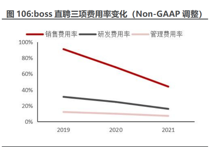 Boss 直聘成立于 2013 年,隶属于看准科技集团,创新性地开创了直聊在线 招聘新模式,从月活用户数角度来看已经发展成为中国最大的在线招聘平台。平台 自上线以来历经了 3 个主要发展阶段:(1)起步阶段(2014-2016):通过布局和 探索移动端+直聊的创新招聘模式,获得如腾讯、众为资本在内的融资支持,B、 C 两端的注册用户数纷纷上涨(2)渗透率提升阶段(2016-2021):投入较高的销 售费用与营销费用,通过极具记忆点的广告词与明星代言人大力宣传提高 app 的 品牌认知度,获得大量用户(3)加速成长阶段(2021-现在):于 2021 年 6 月在 美股纳斯达克上市,随着网络安全审查结束用户注册重新开放,公司业务在资本助 力下加速发展。 2019-2021 年,公司的营收从 9.98 亿元增长至 42.5 亿元,CAGR 达到 106%,毛利率稳定在 86%以上,同时 2021 全年平均月活跃用户数达到了 2710 万,比 2020 年的 1980 万增长了 36.9% ,boss 直聘在发展的第二阶段投入较 大的销售费用与营销费用,随着销售费用率回归到行业的平均水平,boss 直聘在 2021 年首次实现扭亏为盈。