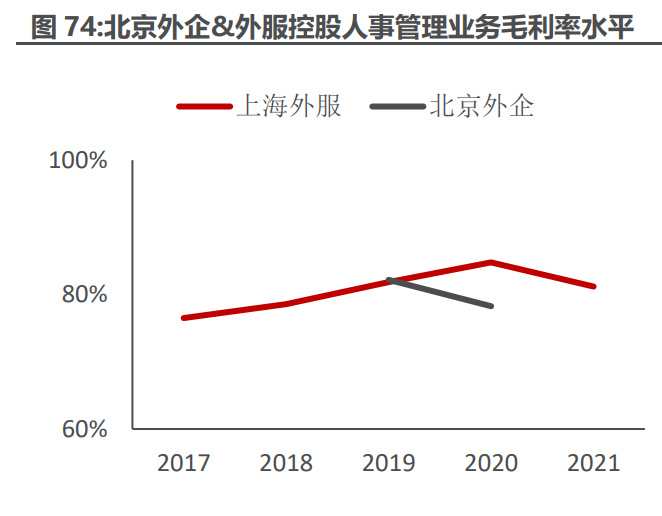 老树发新芽,薪酬福利外包业务进一步协同人事代理业务,深入挖掘客户价值。 薪酬福利外包:包含薪水管理服务、健康管理服务以及商业福利服务三大业务。 1)薪水管理服务:向客户提供包括 HR SaaS 等软件系统应用、薪酬流程服 务外包、考勤管理、工资计算与发放、个税缴纳、个税咨询、财税外包等在内的全 流程薪税管理和咨询服务; 2)健康管理服务:客户将员工健康管理委托给人力资源服务机构提供相关服 务,人力资源服务机构通过对客户员工健康危险因素进行分析和评估,提供健康管 理方案,并根据服务项目和服务标准,自行组织人员或与外部合作伙伴合作完成业 务,客户以业务完成量与人力资源服务机构进行结算的服务方式。 3)商业福利服务:客户将部分或全部与员工福利相关的工作,委托给人力资 源服务机构所属的专业化公司,该专业化公司根据客户的需求,完成福利调研规划、 福利计划方案制定、福利商品或服务的采购组织、福利发放及满意度调研等一系列 工作,客户以福利产品提供的数量以及配套服务的情况与人力资源所属的专业化公司进行结算的服务方式。 从毛利率来看,我们根据北京城乡和外服控股的数据,可以得到人事代理业务 毛利率约 70%-80%,薪酬福利外包业务毛利率为 30%-40%。