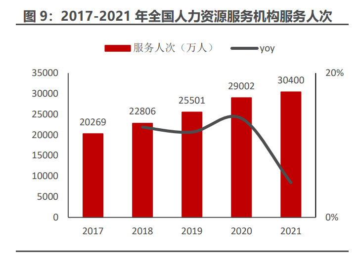 人力资源服务作为链接劳资双方的润滑剂,具备降本增效的作用,有助于缓 解国内劳动力市场、企业端的困境以及产业端的变迁,当就业市场越失灵,人力资 源市场的重要性越加凸显。近 5 年的服务人次和服务用工企业数量递增,也从侧 面的印证了这一判断,2021 年全国人力资源服务机构人次已经达 3.04 亿人次, 服务企业数量达 5099 万家,规模日益壮大。