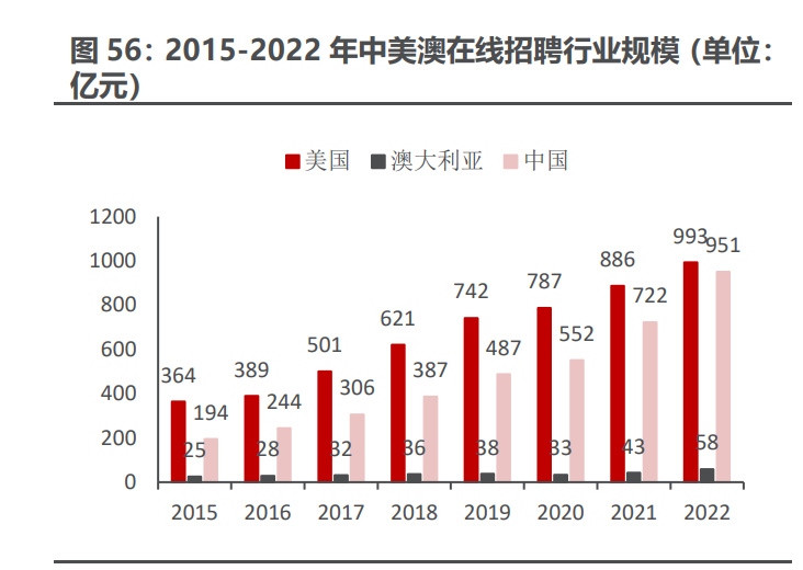 对比在线招聘产业发展相对完善的美国与澳大利亚,我国在线招聘市场增速 疫后复苏更快;根据我们的假设,若以中国、美国在线招聘市场历史 CAGR 测 算,中国整体市场规模以收入计预计将于 2023 年超过美国。根据 IBISWORLD 调研数据,美国 2022 年整体在线招聘行业市场规模以收入计达到了 131 亿美元 约合人民币 886 亿元,2016-2021 的 CAGR 约为 17.9%;根据灼识咨询预测, 2021 年中国在线招聘行业市场规模达到 722 亿元,但是同比增速达到了 30.9% 远高于美国同期的 12.7%,尽管三个国家的增速都在疫情前后呈现了 V 型复苏, 但是中国的增速更快,同时考虑到我国的劳动力人口约为美国的 5 倍,行业规模 的天花板还远未达到,未来巨大的增长空间将随着算法改进、更多招聘 app 商业 模式的出现而实现。考虑到我国目前白领、蓝领人数分别达到 2 亿人、4 亿人, 具有更高跳槽频次的“Z 世代”群体进入职场,在线招聘的渗透率在随着算法匹 配技术的改进条件下,未来在线招聘与欧美、日本等在线招聘产业发展相对较完 善的国家持平。若根据美国和中国 2015-2022 年各自 CAGR 进行计算,2023 年中国市场规模为 2492 亿元,超越美国 2452 亿元。
