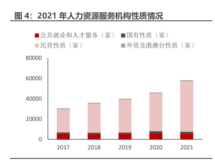 人力资源市场规模已达万亿元,行业吸纳机构数量与从业人员稳步增长,行 业市场化竞争较为充分。据人社部数据,截至 2021 年底,人力资源服务行业整体 营业收入达 2.46 万亿元,从业人员 103.15 万人,全国共有各类人力资源服务机 构 5.9 万家,从占比上来看,目前民营性质人资企业占比最高,2021 年达 4.97 万 家,占比达 86%,国有性质企业占比 4%,目前行业整体市场化竞争较为充分。