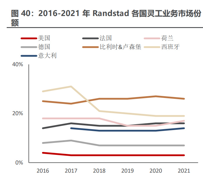 从市场份额来看,国内灵工行业集中度较低,整体呈现“散、小、多“的特征, 对比海外巨头行业存在较大整合空间。灵工行业现阶段进入门槛较低,国内企业大 多以小作坊的形式存在,因此行业规模虽大,但整体呈现出小而散的格局。从前三 大灵工企业来看,若按照易观分析行业规模为基数,我们对国内三家上市企业灵工 业务渗透率进行计算,2021 年 CR3 为 1.61%,每家企业渗透率均不足 1%,行业 格局非常分散。对比海外,Adecco 和 Randstad 在欧美国家市占率较高,2020 年,Adecco 和 Randstad 的 CR2 在法国达到 38%,并且两者在其他欧美地区市占率也达到较高水准。
