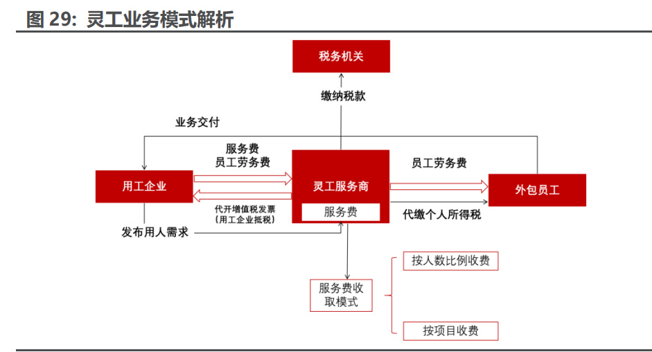 商业模式的本质为抽取服务费用率。灵活用工具有多样的业务形式,其具体 商业模式落到细处也不尽相同,但整体来看大体的方式思路一致。一般由用工企业 发布用人需求,灵工服务商招聘外包员工,外包员工完成业务交付以后,用工企业 向服务商支付员工劳务费以及服务费用,服务费用一般根据外包员工的人数或者 项目总额抽取一定的服务费率。