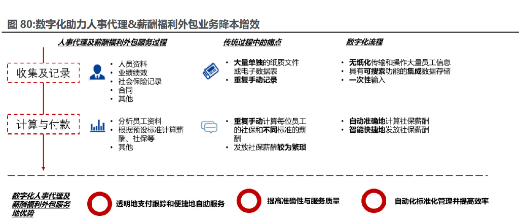 云计算、大数据等数字化手段助力服务商提质增效。云计算、大数据等数字化 手段助力中国人力资源行业起步较晚,于 1990 年代开始发展,2004 年开始进入 软件集成阶段。此后,由于企业合规日益复杂,人事代理及薪酬福利外包的需求提 升,服务商大批涌现。而云计算和大数据等新兴技术的出现推动了该市场迅速发展, 使服务商能够以更低的成本提供更便捷、准确和高效的服务。 对于人事代理及薪酬福利外包服务提供商而言,将创新技术应用于社保、人事 信息管理和合同记录管理等业务可以帮助减少大量的人工工作,实现将分散独立 的信息集成到一个系统中并自动计算社保薪酬,帮助员工在不受时间和地点限制 的情况下访问信息,确保支付计算的准确性和透明度,并提高内部运营效率。同时, 这种职能功能的数字化使服务提供商能够实现业务扩展,更加专注于市场开发地 同时而不会因为雇用额外服务人员而产生额外费用。