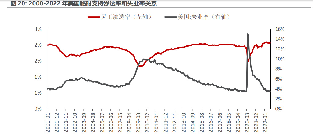 在渗透率还比较低的情况下,灵活用工在经济下行时期依然有较强的成长性, 具备一定的抗周期属性,表现为在经济扩张或复苏时将会呈现高增长,在经济下行 时则体现出一定韧性。从日本和美国的灵活用工和经济的关系我们可以看到,分别 呈现出顺周期和抗周期的特点。美国的灵工渗透率和失业率呈现明显的对称结构, 在失业率高企时其灵工渗透率下降,这体现了灵工行业顺周期的特点;反观日本, 在 90 年代,时值日本经济泡沫破灭、GDP 负增长,但灵活用工渗透率在《劳务派 遣法》实施后一路上行,在 2008 年金融危机时,灵活用工渗透率依然保持坚韧, 充分体现了其抗周期性这一特点。 究其原因,经济景气时,灵活用工行业会同步受益于企业用人需求扩张,而经 济下跌时,企业处于降低用工成本的需求可能更愿意采纳灵活用工。