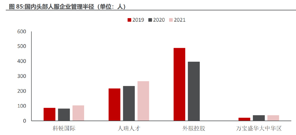 对比国内外人资机构营收和市值也能侧面印证这一点: 国内机构营收体量较头部外资机构相去甚远。根据中国人力资源媒体公司 HRoot 发布的“2021 HRoot 全球人力资源服务机构 50 强榜单(” 榜单以企业 2020 财年营业收入高低为依据,再将所有企业营业收入统一换算为美元后进行排序), 进入榜单的共有五家中国机构,分别为中智、科锐国际、海峡人力、前程无忧、万 宝盛华大中华区,各位列第 4/45/46/47/48。除去中智,我们可以看到科锐、前 尘无忧与头部外资机构营收体量差距甚远。