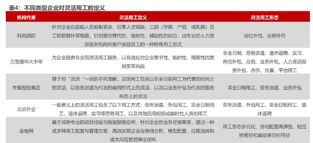 灵活用工起源于美国,伴随二战后失业率增长在发达国家广泛应用并逐步成 熟,目前国内处于快速发展期,“灵活用工”一词尚未成为规范的法律用语。国内 政府部门发布的文件中较早使用“灵活用工“一词是在 2003 年,把非全日制用工 当作适应用人单位灵活用工需要的一种方式。 从企业定义角度来看,头部人服企业对于灵活用工的定义也不完全相同,但 整体来看,灵活用工包含的用工模式广泛,大部分企业都将劳务派遣、外包、非全 日制用工等都当作灵活用工。 我们将区别于标准劳动关系以外的,旨在解决临时性的、季节性的或者周期 性的用人需求并达到借此降低成本目的用工方式定义为灵活用工。“降本增效”和 “满足用工需求”为灵工两大核心要素,在具体的用工形式、劳动关系、劳动时间、 工作地点和管理方式等方面灵活用工都体现一定的弹性。