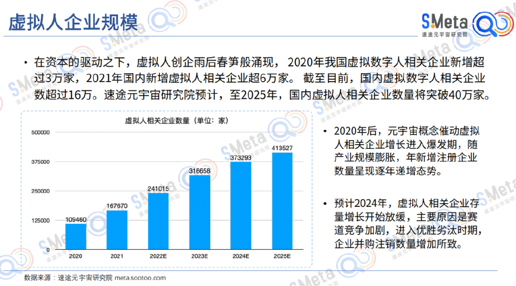 在资本的驱动下,虚拟人创企如雨后春笋般涌现,2020年我国虚拟人相关企业新增超3万家,2021年国内新增虚拟人相关企业超6万家。截至今年3月份,国内虚拟人相关企业超16万。速途元宇宙研究院预计,至2025年,国内虚拟人相关企业数量将突破40万家。