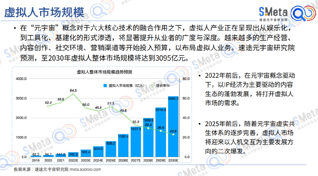 此前,速途元宇宙研究院发布的《2022虚拟人产业研究报告》中预测,至2030年虚拟人整体市场规模将达到3095亿元。
