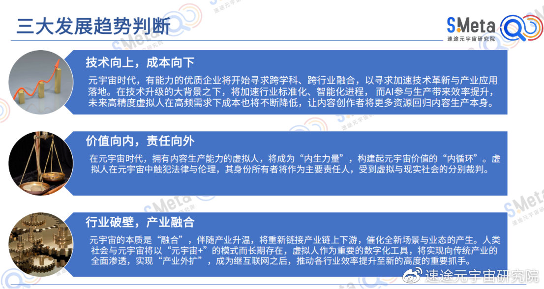 元宇宙时代,有能力的优质企业将开始寻求跨学科、跨行业融合,以寻求加速技术革新与产业应用落地。在技术升级的大背景下,将加速行业标准化、智能化进程,而AI参与生产带来效率提升,未来高精度虚拟人在高频需求下成本也将不断降低,让内容创作者将更多资源回归内容生产本身