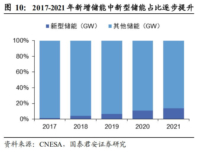 国内大储发展迅猛,装机容量快速增加。根据CNESA,截止2021年底, 全国累计储能装机规模达到46.1GW,同比增长 29.49%,其中新型储能 装机 6.3GW,同比增长56.4%,新型储能中90%为电化学储能,装机功 率5.6GW,同比增长 77.9%。2021年中国新增储能装机 10.5GW,同比增长228.1%,2017-2021年中国新增储能装机年均复合增长率高达65.7%。 据储能与电力市场,22年国内储能新增投运量超 12GWh;据CESA, 22年国内新型储能新增投运装机6.21GW/14.32GWh。储能行业整体装 机规模持续高景气。同时以电化学储能为代表的新型储能技术高速发展, 推动新型储能在整体储能装机规模中占比逐渐提升。