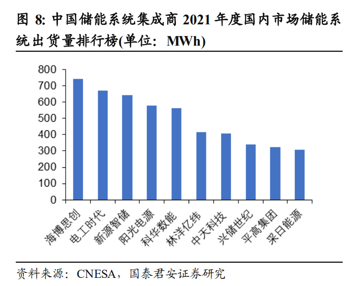 众多企业纷纷布局储能行业,尤其是电池与电力设备公司。储能电池脱 胎于动力电池,且产线有一定通用性,动力电池企业有发力储能电池的 天然优势,其中 2021 年宁德时代排名全球储能电池市场出货量第一。 电力设备企业大多从储能变流器等电力部件供应做起,具备天然的渠道 与技术优势,并陆续转型储能系统集成商,其中代表性企业有电工时代、 阳光电源、科华数据等。