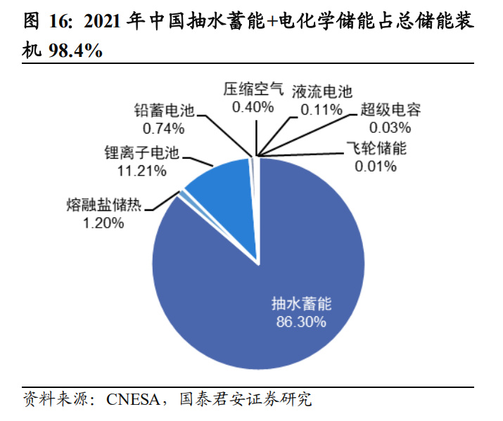 抽水蓄能与电化学储能是国内主要的储能技术,电化学储能发展迅猛。 现有储能技术路线包括物理储能(抽水蓄能、压缩空气储能、飞轮储能)、 电化学储能(锂离子电池、铅碳电池、液流电池、钠硫电池)、电磁储 能(超级电容、超导储能)、相变储能(熔融盐储热、高温相变储热)、 氢储能。根据 CNESA 数据统计,截止 2021 年底,中国储能项目累计装 机规模达 46.1GW,其中抽水蓄能占比 86.3%,电化学储能占比 12.1%, 合计占比 98.4%。虽然抽水蓄能技术成熟,但其受地理资源条件制约, 并且能量密度较低,发展空间有限;而电化学储能,尤其是锂离子电池 储能具有寿命长,能量密度高,效率高等优点。根据 CNESA 数据,2017 年至 2021 年,中国电化学储能装机由 0.39GW 增长至 5.58GW。2022 年 10 月电化学储能项目新增 10GW(备案/在建/运行)。电化学储能发展前景广阔。