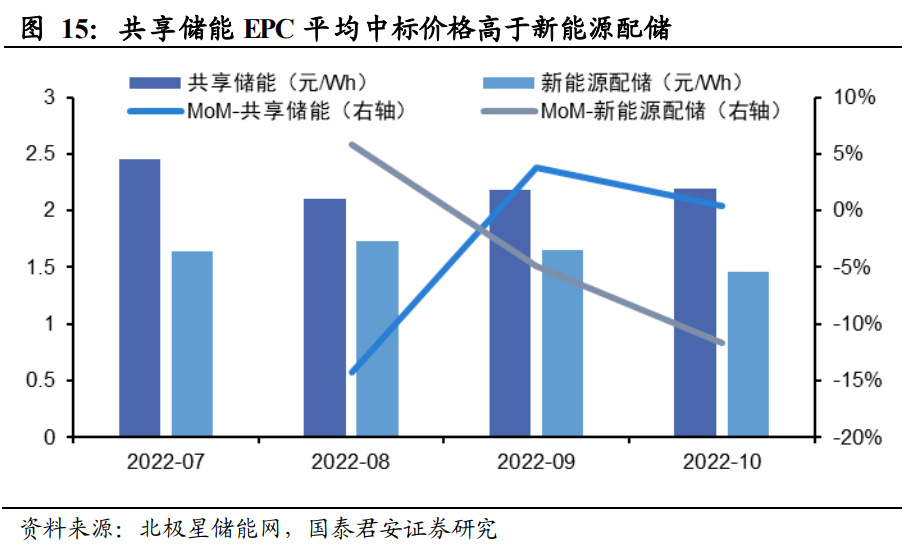 共享储能相较新能源配储 EPC 成本更高。根据北极星储能网统计数据, 2022 年 10 月发电侧储能(共享储能)EPC 平均中标价格为 2.19 元/Wh, 高于电源侧储能(新能源配储)EPC 的平均中标价格:1.46 元/Wh。共 享储能 EPC 价格更高的原因有:(1)配储电站可依靠新能源场站的设备 进行升压、并网;而独立储能电站除逆变器外还需配套建设升压站、配 电装置等设备;(2)独立储能需要配置电网调度相关设备,进行更加全 面并网实验,相关费用较高;(3)受到新能源场站发电侧成本的挤压, 配储电站的成本被严格控制;(4)独立储能电站对安全性、寿命以及效 率的较高要求使得其电芯、逆变器等关键环节的成本较高;(5)部分独 立储能电站还需要考虑土地费用。
