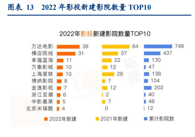 渠道格局看,长尾市场出清,头部公司长期市占率有望提升。疫情管控下影院营业率大 幅下滑叠加固定经营成本支出,带来长尾市场出清以及头部影投市占率小幅提升。但也 可以发现在疫情相对稳定的 21 年,影投集中度有所回落,可能是市场缓和情况下部分中 小影院重新开张所致。基于此推测,reopen 后头部影投市占率或短期小幅下滑;但长期 看,头部公司具备更强的资金实力(带来扩张速度与选址优势),以及较高效的经营效率 (规模效应+管理经验丰富),市占率有望提升。