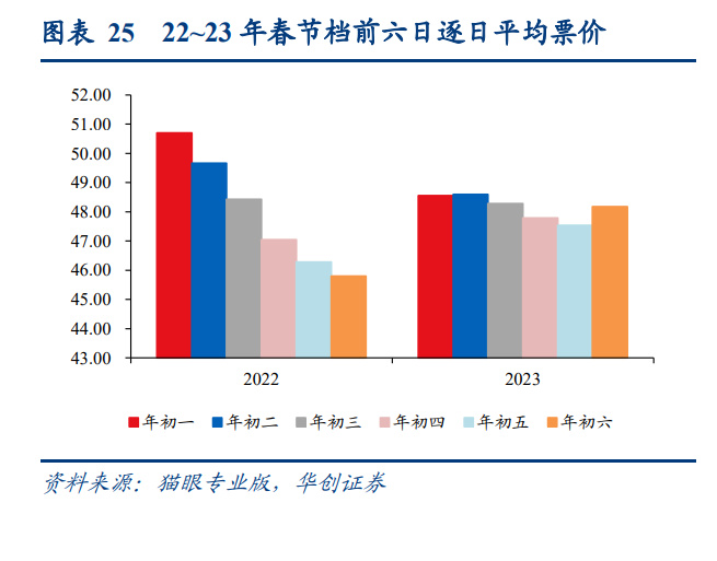 逐日量价看:观影人次趋势坚挺,整体票价基本维稳。1)观影人次看,首日略承压,后 续逐步追平 19 年水平,且呈现更坚挺的态势。23 年初一到初六观影人次分别为 0.25/0.21/0.21/0.21/0.21/0.19 亿人(19 年同期为 0.32/0.22/0.21/0.19/0.19/0.18 亿人),同比 21 年分别-2%/9%/13%/23%/21%/21%;2)票价角度看,初一到初六平均票价分别为 48.6/48.6/48.3/47.8/47.5/48.2 元,整体变化不大。