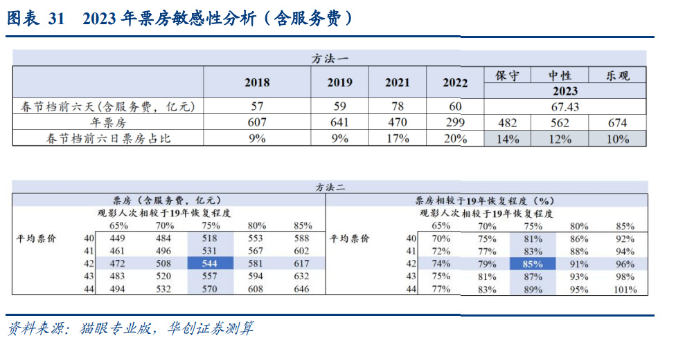 (二)大盘测算:乐观估计 23 年大盘可恢复至 8 成以上,影院经营杠杆带来利润弹性